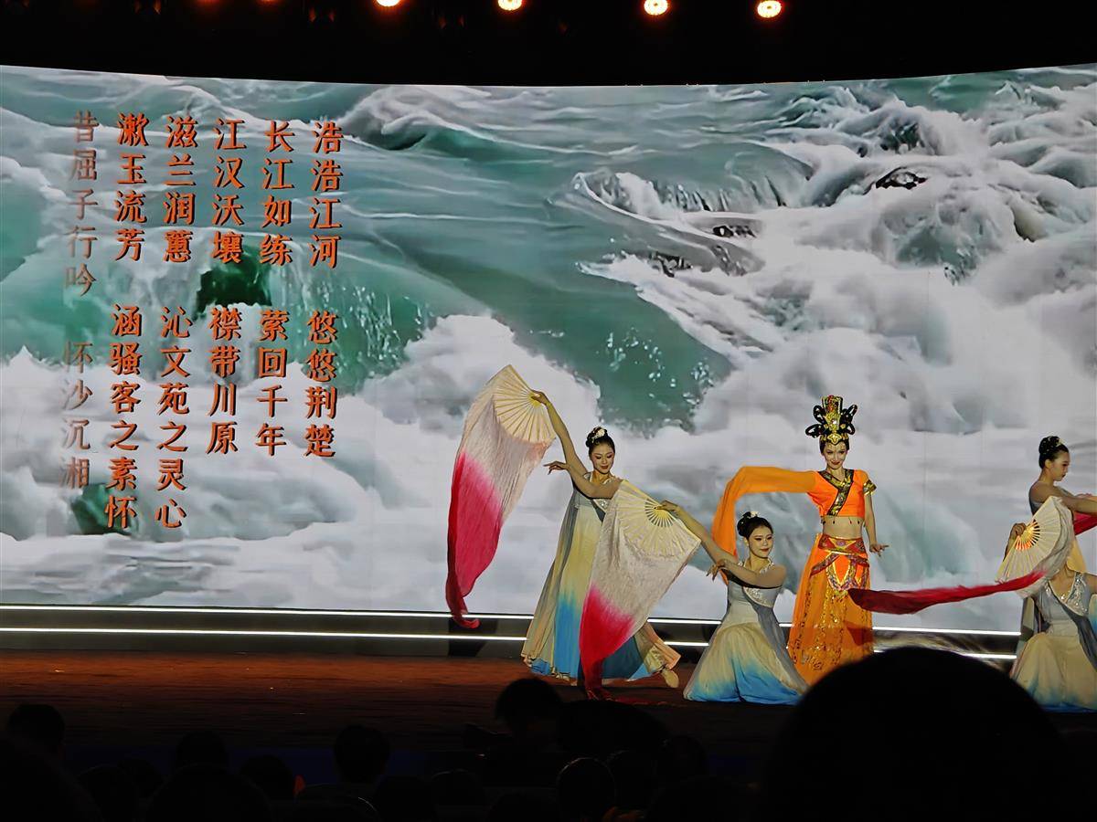 晚会以筹备专题片《长江:文学之河》拉开帷幕,该片沿着长江的流动,探讨长江与文学的互补性。观众沉浸在“长江是文学梦想家的道路和呼唤”的感受中。序幕《江水的礼物》中,舞蹈、钟声、古琴交织,诗歌与影像交融,荆州文化脉络在光影中流动。
