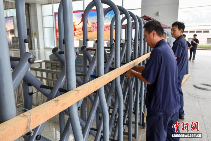 9月24日,海库东站工作人员在出口处加强了可伸缩的门,准备抵抗台风。根据受台风“巴巴扎”影响的海南铁路公司的说法,海南高速铁路将于9月24日14:04暂停,haiku市的火车将被中国新闻社的记者Luo Yunfei暂停。